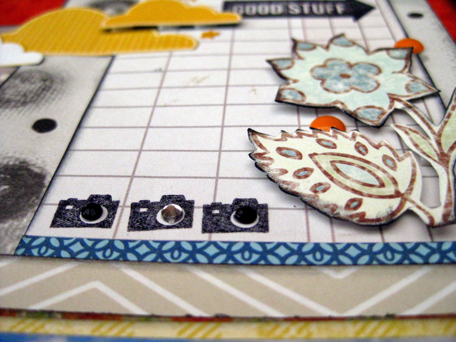 I grabbed out my stamps for this layout and used the two little camera ones I had to add as borders. I also cut out some flowers from some patterned paper. The clouds were also cut from patterned paper. The arrows were cut using my Big Shot and embossed through it too.